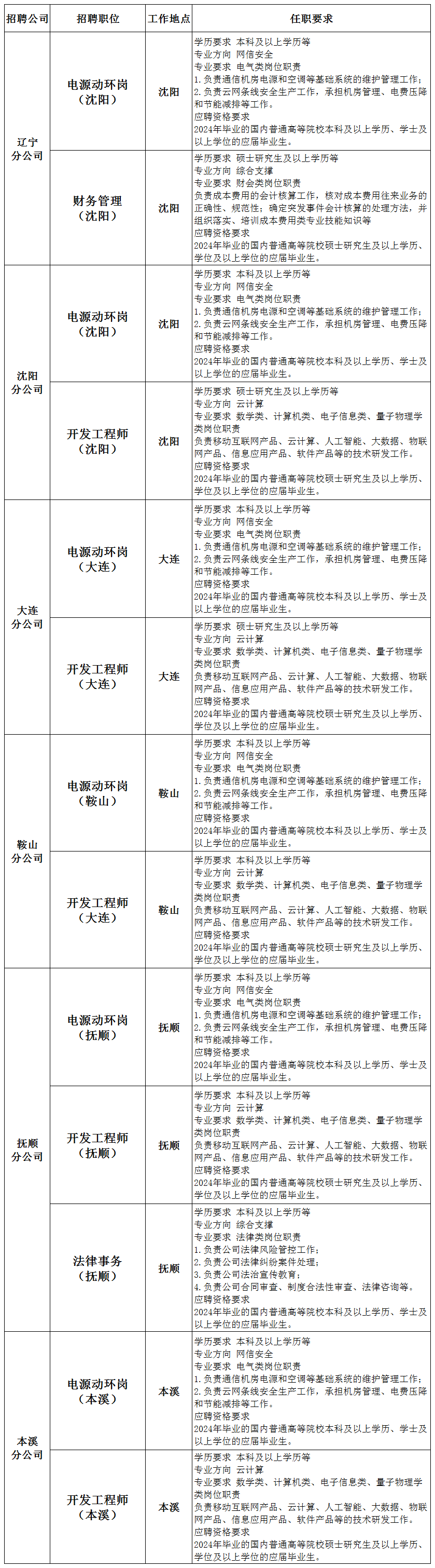 1、本次招聘活动主要面向2024届国内外普通高等院校毕业的本科生、硕士生及博士生。2、2023届国内外普通高等院校毕业未就业的本科生、硕士生及博士生也可投递,具体以各分子公司岗位应聘资格的要求为准。中国电信集团有限公司及所属分子公司发布招聘岗位主要类别有:市场、销售与服务、产品、企业信息化、网发建设、网络维护与服务支撑、研发以及综合支撑(行政文秘、法律、财务审计、人力资源管理等)等八大类岗位。除中国电信集团有限公司集中组织的春季招聘线上统一笔试外(部分单位参与,以后续通知为准),本次招聘由中国电信集团所属分子公司根据招聘计划,自行组织笔试面试。各单位将根据简历筛选情况,安排学生参加笔试、面试。我们将通过电子邮件或短信方式进行通知。您也可以通过中国电信招聘网站查询各分子公司的笔面试通告。中国电信集团所属分子公司根据筛选及笔面试成绩情况,确定录用名单,并通知学生签署三方协议。各单位具体通知签署协议的时间,将根据校园招聘进度情况确定。中国电信集团辽宁地区招聘职位信息如下: