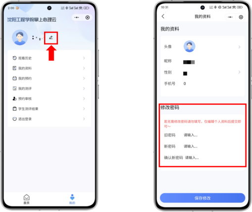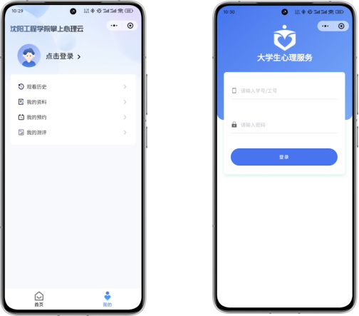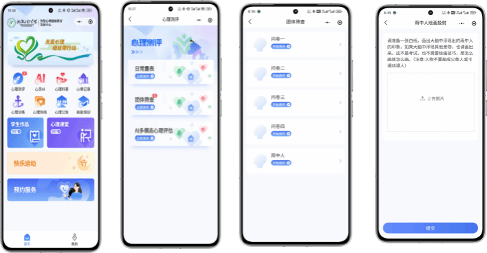 4.进入首页后,点击心理测评-团体筛查即可答题(注:共需参与4个量表和1个测试),雨中人测试可根据提示进行作画。